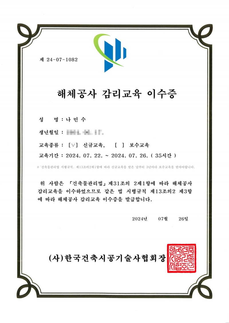 해체공사감리교육이수 페이지 정보 작성자 최고관리자 댓글 0건 조회 83회 작성일 24-08-22 10:07 목록 본문 해체공사감리교육이수 이전글화성시 건축위원 위촉장 24.08.24 다음글정밀안전진단교육수료 24.08.22 댓글 0 댓글목록 등록된 댓글이 없습니다.